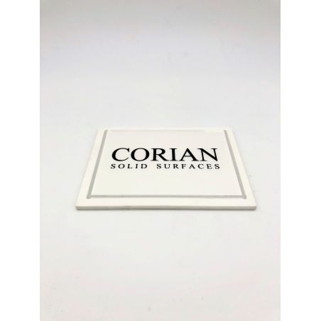 Support signalétique 175x130mm avec base en CORIAN (résine blanche mat) et capot en plexiglass. Idéal pour affichage prix en vitrine ou sur une table de présentation.
